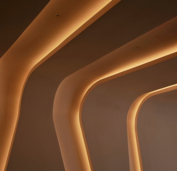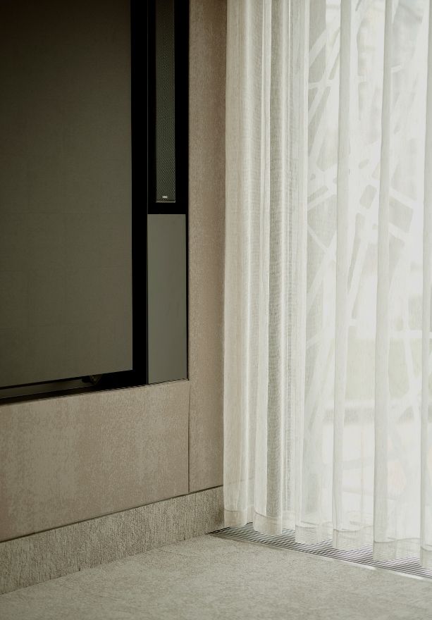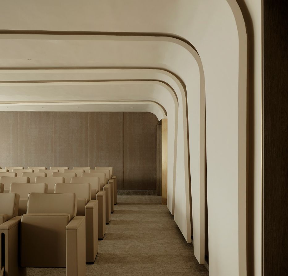 La selección material combina madera, latón, textiles claros y estucos para generar calidez sin comprometer la solemnidad institucional. Cada material responde a durabilidad y mantenimiento específicos del uso corporativo.